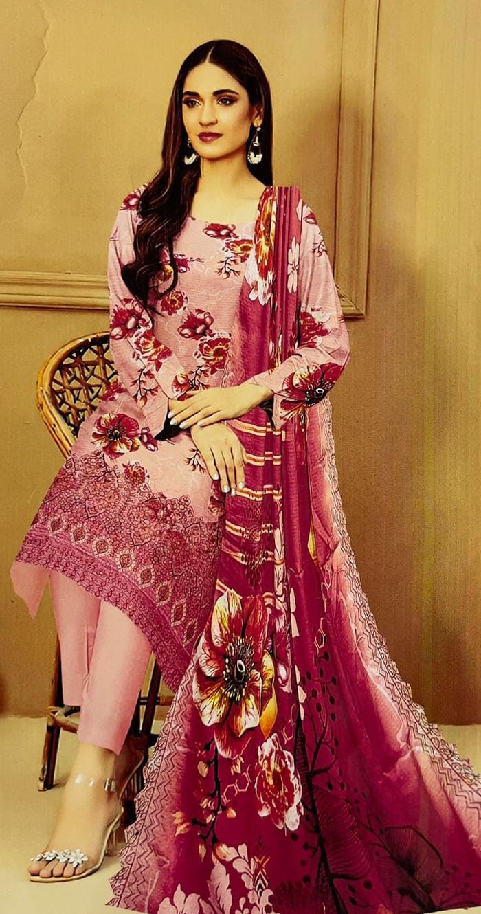 Step into effortless elegance with this rose pink floral printed 3-piece dress set, designed for women who love a soft, feminine, and graceful look. The rich floral patterns combined with delicate borders create a timeless outfit suitable for both casual and semi-formal wear.